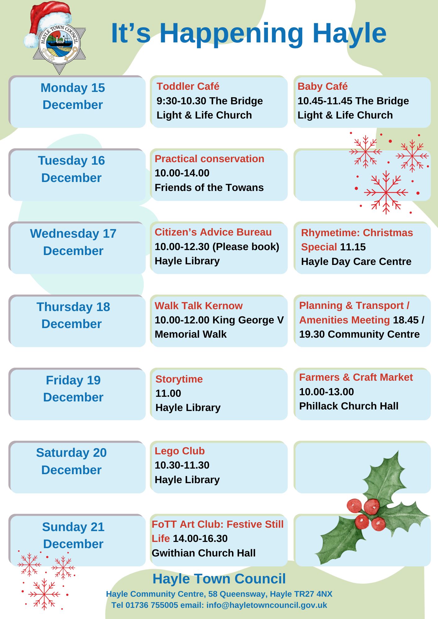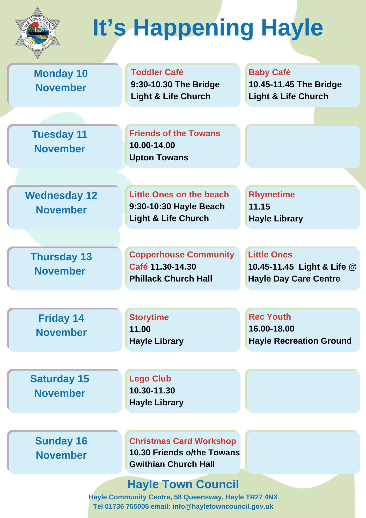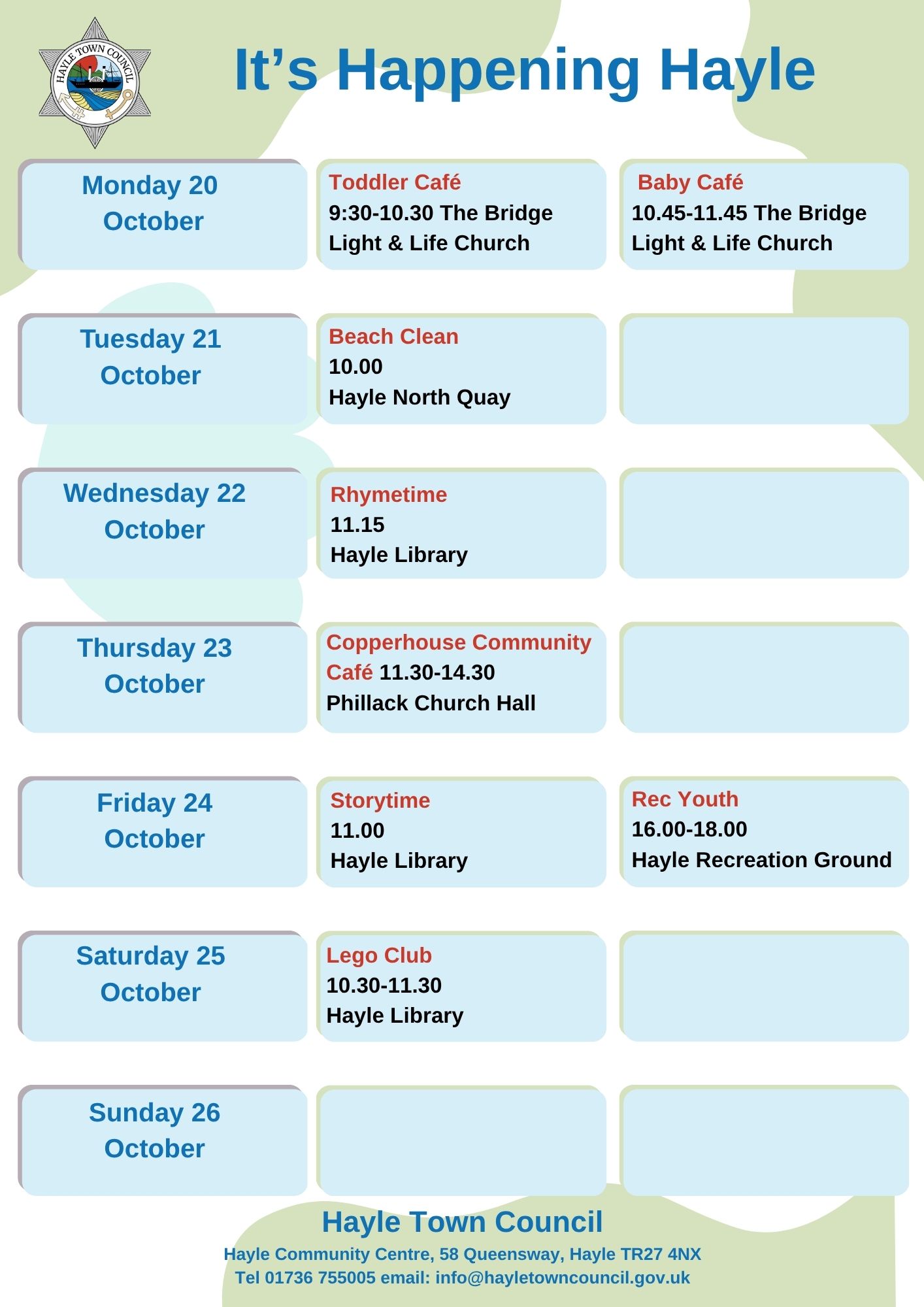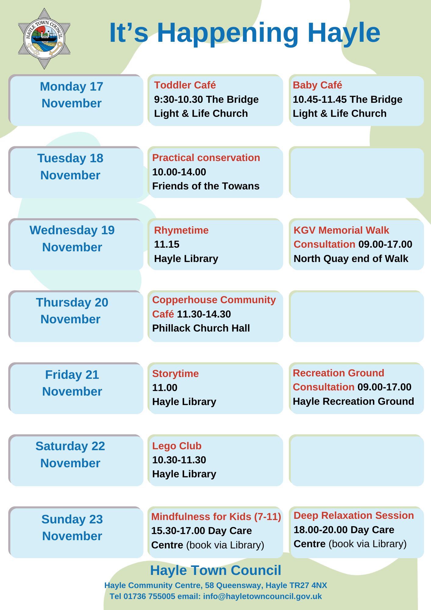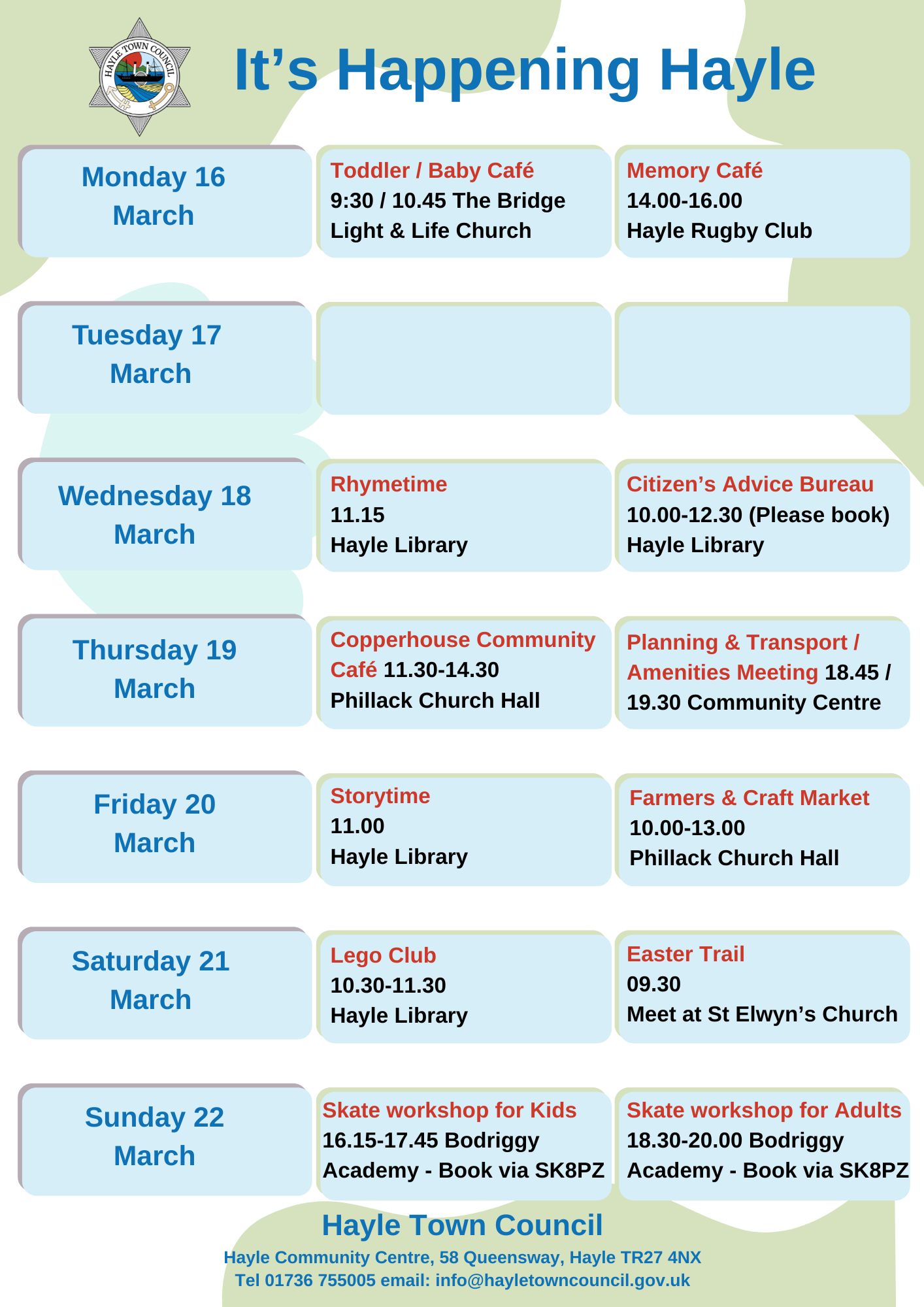 Hayle Town Council manages Hayle Community Centre, Hayle Outdoor Swimming Pool, Lethlean Lane Allotments, Public Conveniences, Hayle Recreation Ground, King George V Memorial Walk, Jubilee Path, The Millpond (not the play area), The Plantation and other small pockets of green land.