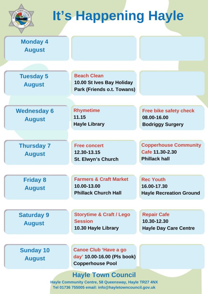 Hayle Town Council manages Hayle Community Centre, Hayle Outdoor Swimming Pool, Lethlean Lane Allotments, Public Conveniences, Hayle Recreation Ground, King George V Memorial Walk, Jubilee Path, The Millpond (not the play area), The Plantation and other small pockets of green land.