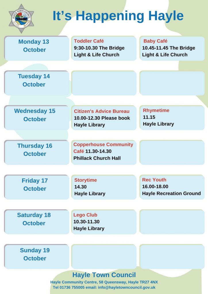 Hayle Town Council manages Hayle Community Centre, Hayle Outdoor Swimming Pool, Lethlean Lane Allotments, Public Conveniences, Hayle Recreation Ground, King George V Memorial Walk, Jubilee Path, The Millpond (not the play area), The Plantation and other small pockets of green land.