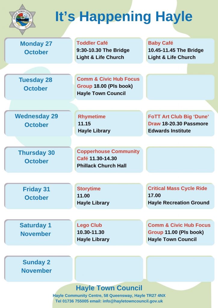 Hayle Town Council manages Hayle Community Centre, Hayle Outdoor Swimming Pool, Lethlean Lane Allotments, Public Conveniences, Hayle Recreation Ground, King George V Memorial Walk, Jubilee Path, The Millpond (not the play area), The Plantation and other small pockets of green land.