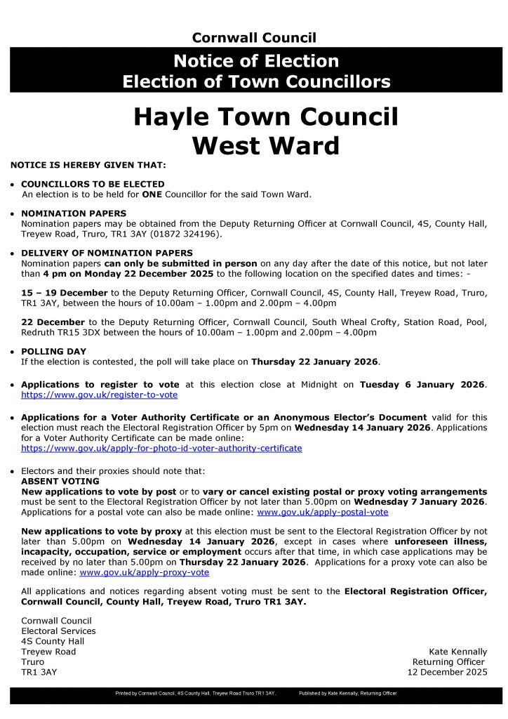 Hayle Town Council manages Hayle Community Centre, Hayle Outdoor Swimming Pool, Lethlean Lane Allotments, Public Conveniences, Hayle Recreation Ground, King George V Memorial Walk, Jubilee Path, The Millpond (not the play area), The Plantation and other small pockets of green land.