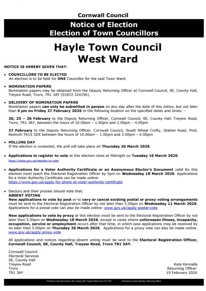- Nomination paper, home address form and consent to nomination must be delivered in person/by hand: -• 20, 23 – 26 February (10.00am – 1.00pm & 2.00pm – 4.00pm)• To The Deputy Returning Officer, 4s, County Hall, Truro TR1 3AYOR