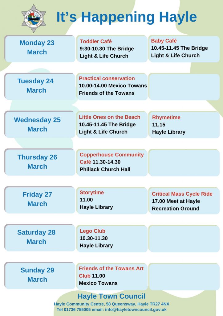 Hayle Town Council manages Hayle Community Centre, Hayle Outdoor Swimming Pool, Lethlean Lane Allotments, Public Conveniences, Hayle Recreation Ground, King George V Memorial Walk, Jubilee Path, The Millpond (not the play area), The Plantation and other small pockets of green land. Find out more