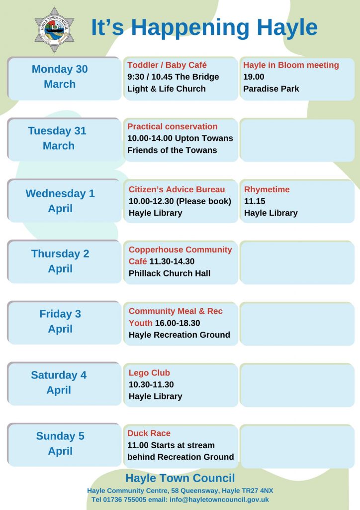 Hayle Town Council manages Hayle Community Centre, Hayle Outdoor Swimming Pool, Lethlean Lane Allotments, Public Conveniences, Hayle Recreation Ground, King George V Memorial Walk, Jubilee Path, The Millpond (not the play area), The Plantation and other small pockets of green land. Find out more