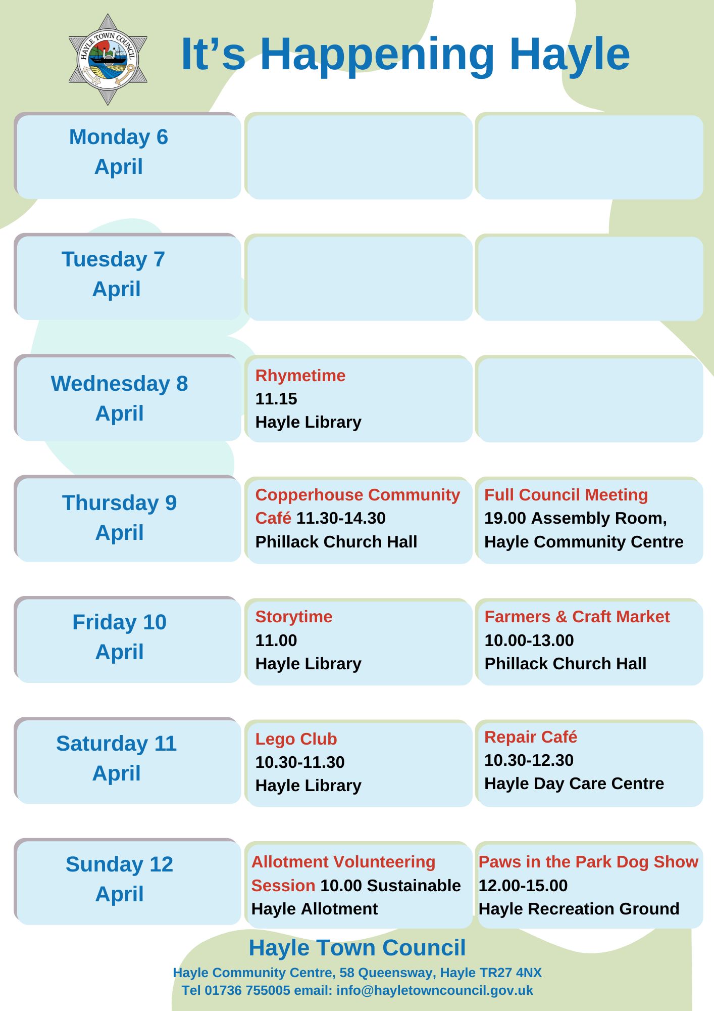 Hayle Town Council manages Hayle Community Centre, Hayle Outdoor Swimming Pool, Lethlean Lane Allotments, Public Conveniences, Hayle Recreation Ground, King George V Memorial Walk, Jubilee Path, The Millpond (not the play area), The Plantation and other small pockets of green land.