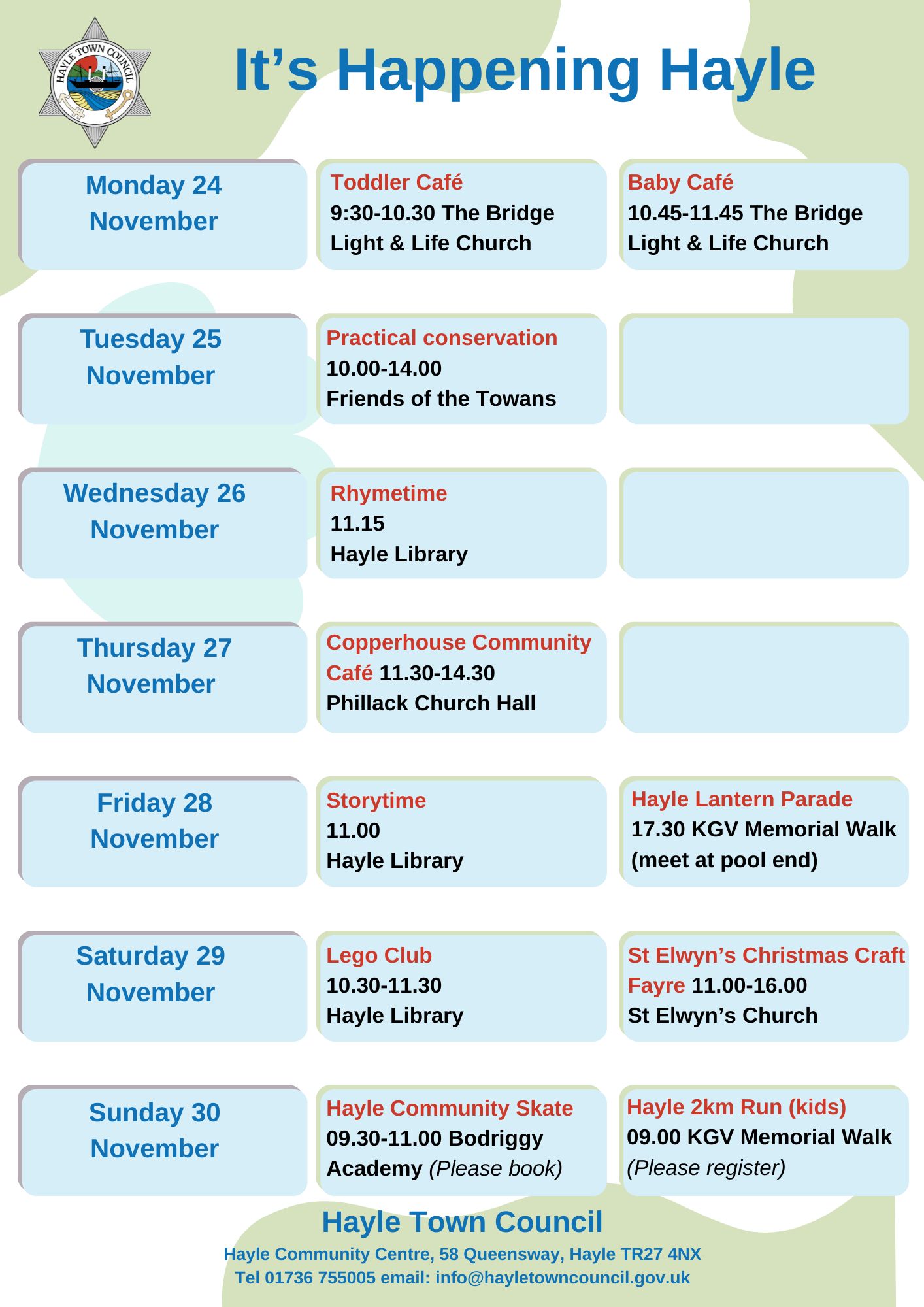 Hayle Town Council manages Hayle Community Centre, Hayle Outdoor Swimming Pool, Lethlean Lane Allotments, Public Conveniences, Hayle Recreation Ground, King George V Memorial Walk, Jubilee Path, The Millpond (not the play area), The Plantation and other small pockets of green land.