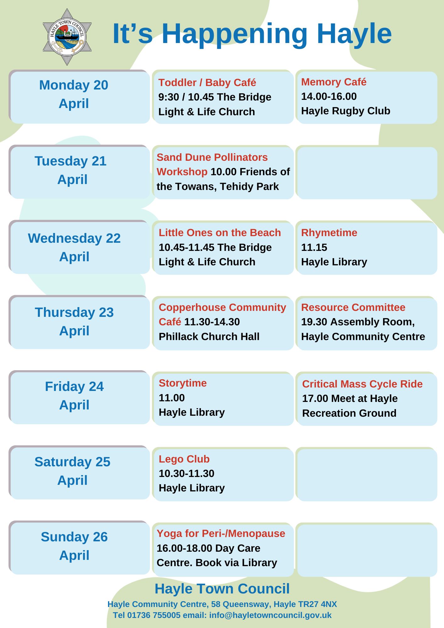 Hayle Town Council manages Hayle Community Centre, Hayle Outdoor Swimming Pool, Lethlean Lane Allotments, Public Conveniences, Hayle Recreation Ground, King George V Memorial Walk, Jubilee Path, The Millpond (not the play area), The Plantation and other small pockets of green land.